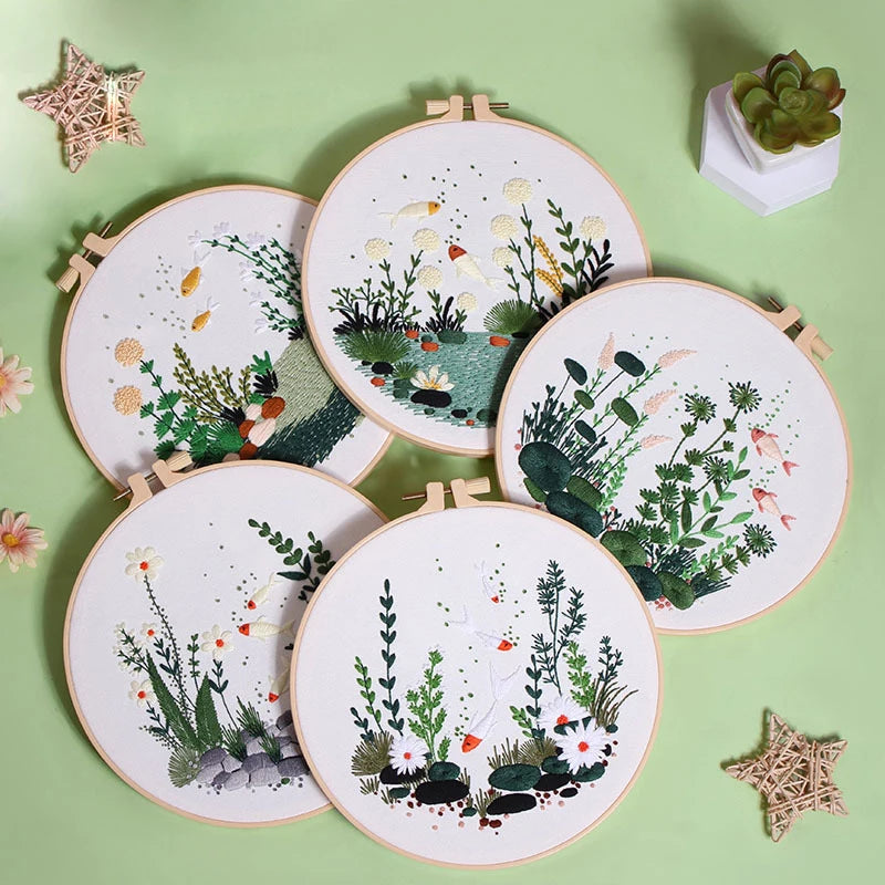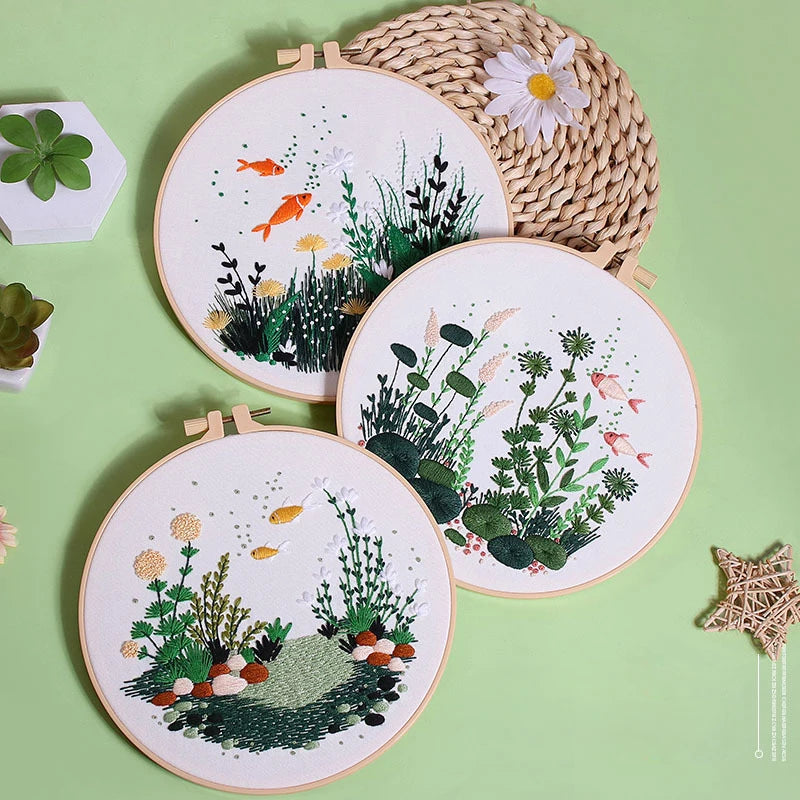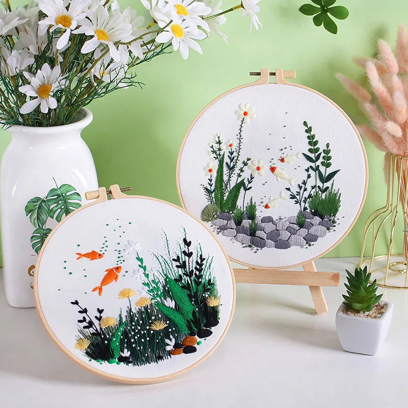 Dive into a peaceful world of stitching with the CraftHoop Fish Garden Embroidery Kit. Featuring graceful fish swimming among lush greenery and blooming underwater plants, each design brings a touch of tranquility and charm to your embroidery journey.